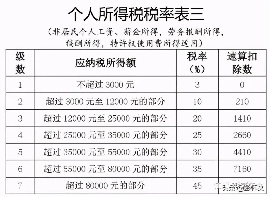 非居民个人的工资、薪金所得,以每月收入额减除费用五千元后的余额为应纳税所得额;劳务报酬所得、稿酬所得、特许权使用费所得,以每次收入额为应纳税所得额,适用个人所得税税率表三(见附件)计算应纳税额。劳务报酬所得、稿酬所得、特许权使用费所得以收入减除百分之二十的费用后的余额为收入额;其中,稿酬所得的收入额减按百分之七十计算。