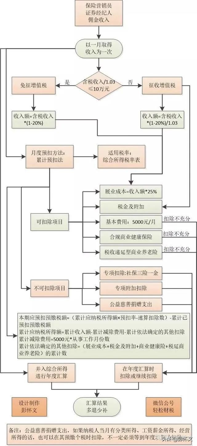 具体案例,就不再讲述了,可以在网上搜索老彭发布的文章《保险营销员、证券经纪人佣金收入预扣个税的特殊算法(含流程图)》,里面有专门的案例,这里就分享一下流程图吧。