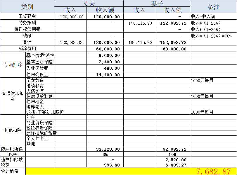 没有算专项附加扣除的情况下,老张两口子合计纳税为7682.87元。