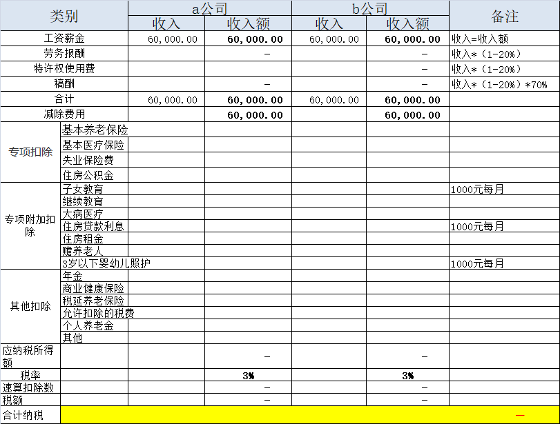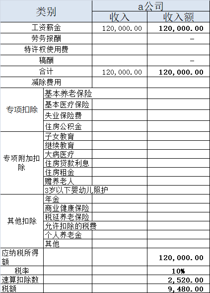 老张有两个公司a、b公司,a公司发工资12万,b公司不发工资,假设没有社保公积金,也没有专项附加扣除。