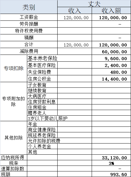 很显然,妻子适用税率10%,老张适用税率3%,扣除项目放在妻子一边达到的抵税效应更大。