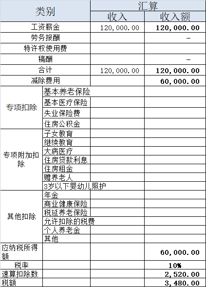 第二年老张汇算,因为一个人只能扣除一个6万,汇算时候个税如下: