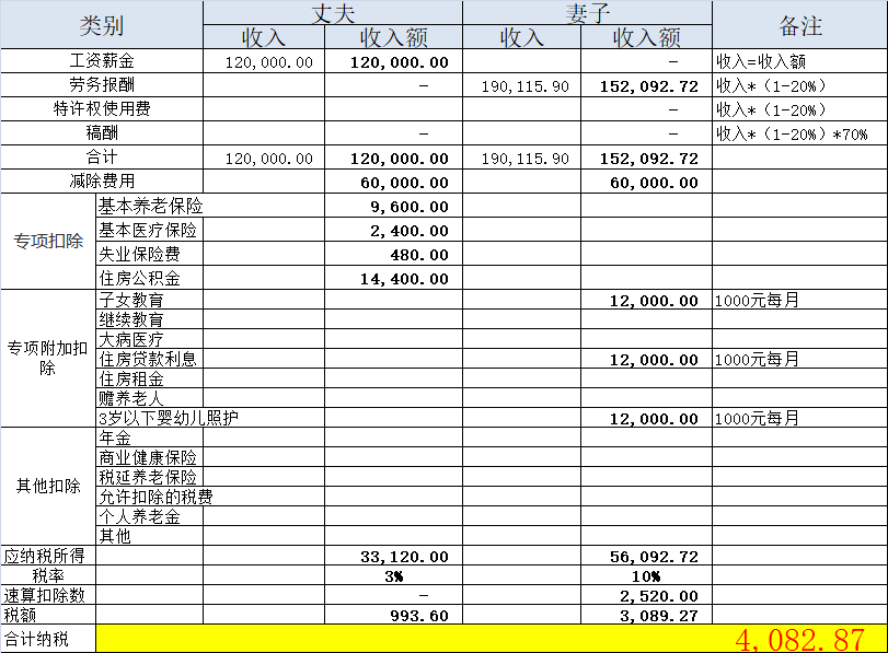 专项附加扣除放在妻子一边扣除的情况下,老张两口子合计纳税为4082.87元。
