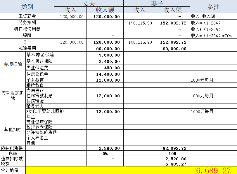 专项附加扣除放在老张一边扣除的情况下,老张两口子合计纳税为6689.27元。
