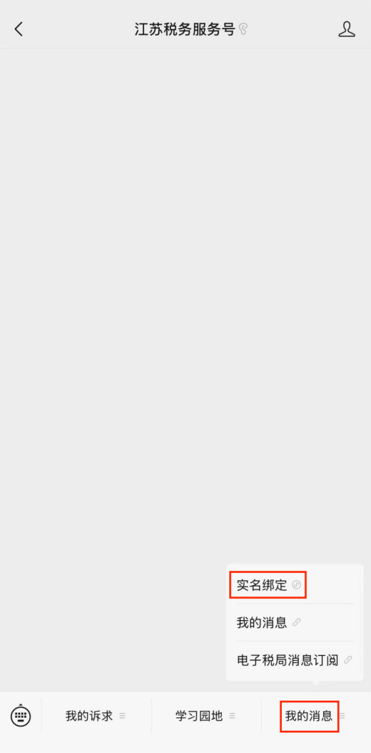 (2)关注“江苏税务服务号”后,点击右下角【我的消息】-【实名绑定】,按照要求完成操作。