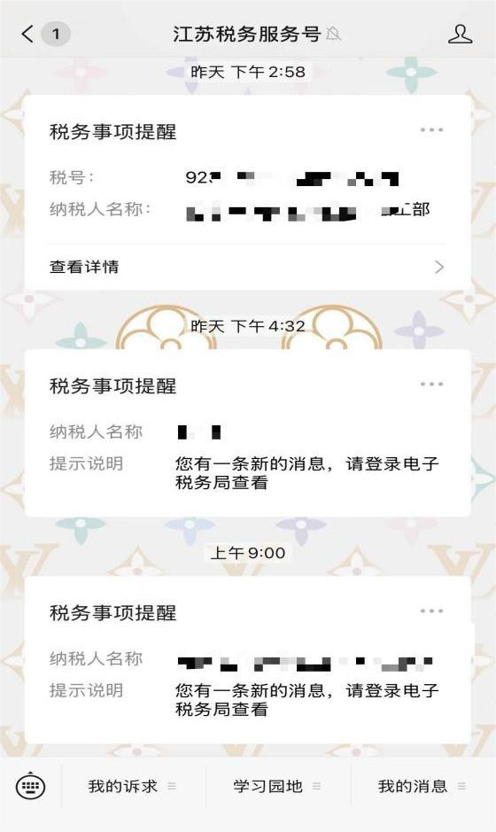 为了保障您涉税信息安全,您在“江苏税务服务号”中接收的消息提醒不能直接查看具体内容,需要您登录电子税务局网页端或电子税务局APP查看提醒详情。