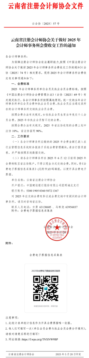 云南省注册会计师协会关于做好2025年会计师事务所会费收交工作的通知