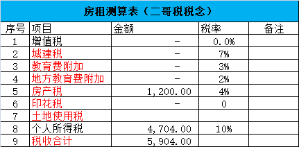 假如出租个人住房取得年租金60000,开具专票发票的话,那么实际应该缴纳的税分别是: