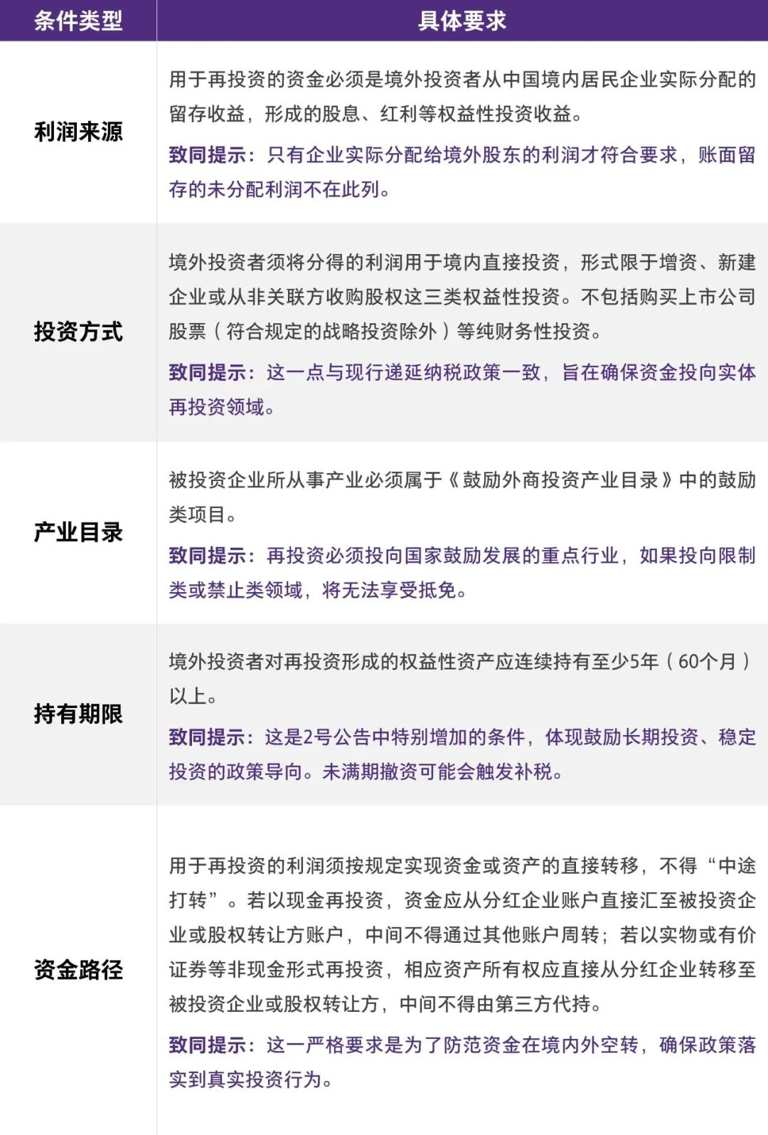 政策有效期方面,2号公告施行时间为2025年1月1日至2028年12月31日。在此期间发生的符合条件的再投资均可按规定享受税收抵免。如果境外投资者在2025年1月1日到公告发布(6月27日)之前已进行了符合条件的再投资,可在公告发布后申请追补享受抵免,将相应抵免额用于冲抵公告发布日之后产生的应纳税额。但2025年之前的投资不可追溯适用这一新政。