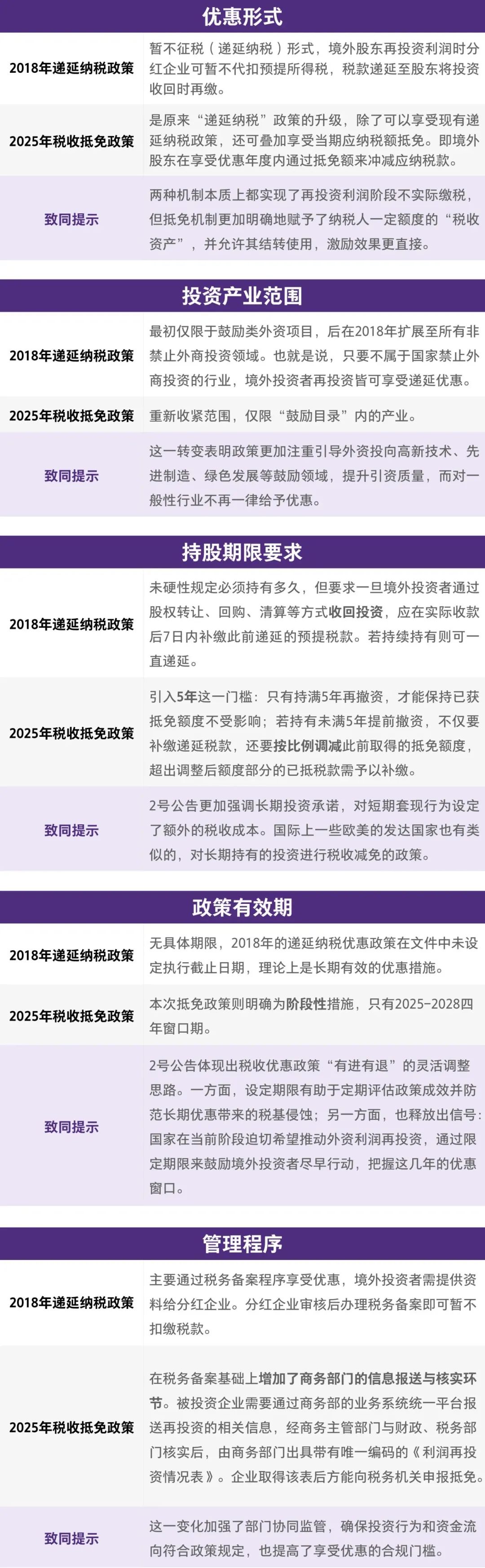 2018年的利润再投资递延纳税政策(财税〔2018〕102号及配套公告)与此次2025年抵免新政(2号公告)在机制和适用范围上都有显著不同,反映出政策取向的演进: