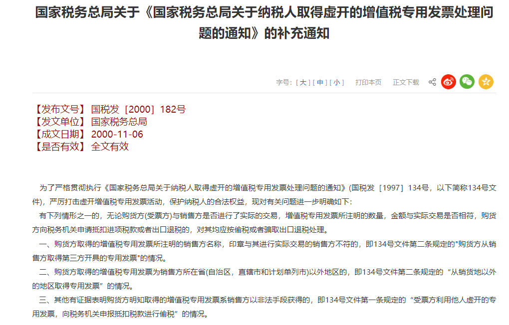90年代我国还处于手工开票的时代,企业首先需要凭证件到税务机关申请,经过税务机关审批后,方能领购一定数量和额度的空白增值税专用发票。企业发生销售业务后,再对外手工填开发票。由于空白发票上的信息非常简单,只有省份、代码、发售税务机关印章等,包括销售方名称在内的发票要素都可以手工填写,这就意味着一家企业领购出来的空白增值税专用发票,仍然可以交给其他企业使用。同时当时发票领购程序不便,额度严格受限,有的企业碍于审批流程过于复杂,为了方便不去税务机关领购发票,从其他企业购买空白增值税专用发票,还有的企业因为发票限额无法满足经营需要,也选择从其他企业购买空白增值税专用发票,因此出现了一些以倒卖空白增值税专用发票为业的空壳企业,更有甚者非法印制增值税专用发票再倒卖,严重扰乱了发票管理秩序。当时,对非法购买空白增值税专用发票以及非法购买伪造、变造的增值税专用发票后再填开的行为是否属于虚开行为,以及应当如何处理,仍缺乏全国统一、明确的规定,在此情况下,国家税务总局又于2000年11月6日发布了《关于<国家税务总局关于纳税人取得虚开的增值税专用发票处理问题的通知>的补充通知》(国税发〔2000〕182号),对相关问题进行了明确。