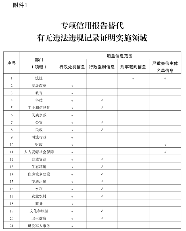 附件:1.专项信用报告替代有无违法违规记录证明实施领域