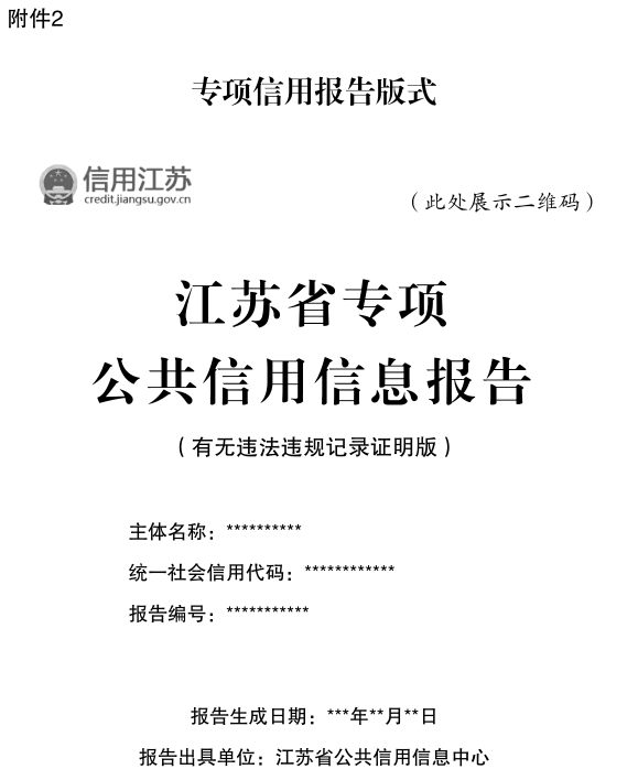依托省公共信用信息系统共享经营主体违法违规行为信息,并依申请为经营主体开具江苏省专项公共信用信息报告(以下简称专项信用报告),证明其报告期内在江苏省行政区域内相关领域有无违法违规记录的情况,替代经营主体赴多个部门(单位)单独出具的有无违法违规记录证明。
