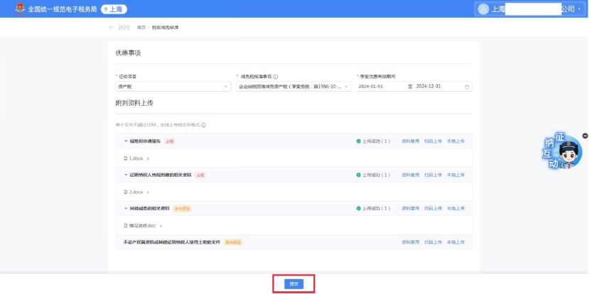 纳税人对照《公告》中适用的不同困难减免类型,上传对应的证明资料。逐一上传后点击下方“提交”按钮。