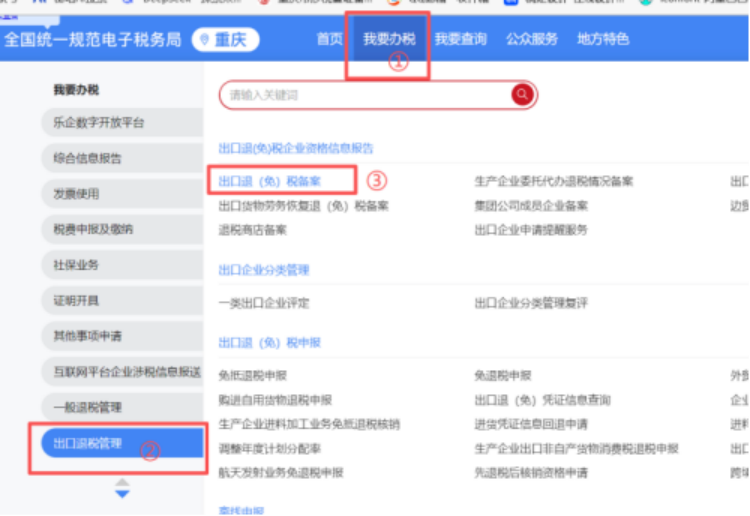点击【我要办税】-【出口退税管理】-【出口退(免)税企业资格信息报告】-【出口退(免)税备案管理】功能菜单。