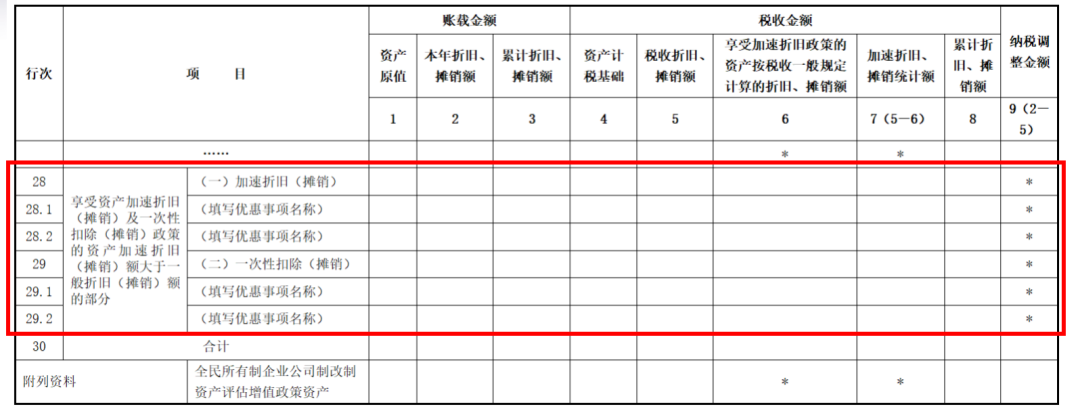 参照主表优惠事项填报方式,对《资产折旧、摊销及纳税调整明细表》(A105080)进行调整,将表单中涉及固定资产和无形资产加速折旧或摊销的优惠项目整合到5080表第28行至第29行填报,纳税人可根据《企业所得税申报事项目录》选择填报。享受资产加速折旧(摊销)及一次性扣除(摊销)政策的资产加速折旧(摊销)额大于一般折旧(摊销)额的部分:加速折旧(摊销)、“一次性扣除(摊销)”