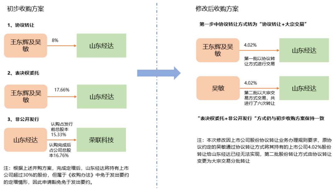 山东经达收购荣联科技的初始交易方案为表决权委托+协议转让+非公开发行,2021年交易所修订了协议转让业务办理规则,“与上市公司收购相关的协议转让”不再构成协议转让股份比例需达到5%以上的例外情况。因此,荣联科技对原定第二笔4.02%的协议转让安排进行了调整,同时由于转让方系大股东,通过大宗交易减持需要遵守连续90个自然日不超过2%的规定,遂最终通过多次大宗交易完成了对应股份的转让: