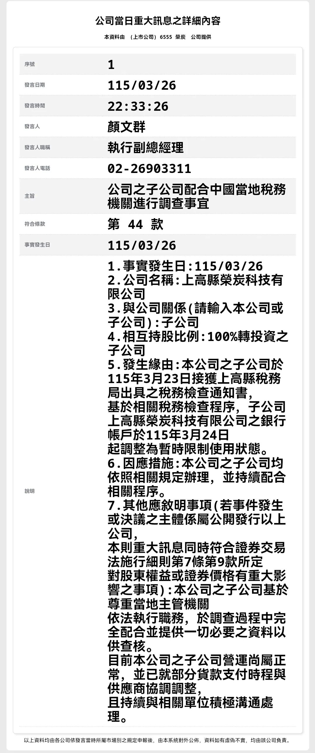 1.『荣炭科技股份有限公司』成立于2009年12月21日,总资本额3.85亿元新台币(约合7仟7百万元人民币),是一家专业研发与生产锂电池负极材料与人造石墨散热片(石墨纸,Graphitesheet)之制造厂商。公司营运总部及研发中心设立在中国台湾新北市汐止区亚东科学园区,负极材料生产工厂及品检中心设立于中国广东省江门市崖门镇登高石工业区,占地12,000平方余米,并于2011年2月通过ISO9001-2008认证。