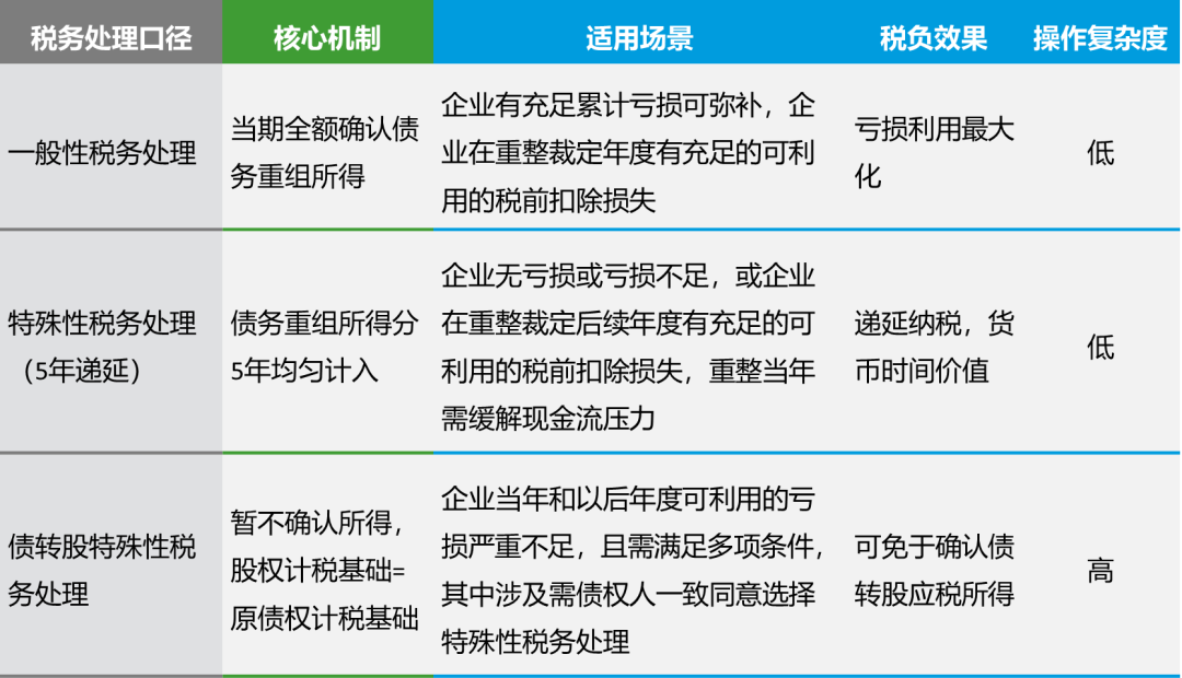 容诚认为,重整企业可以综合评估会计处理、潜在债务重组所得规模、自身税务盈亏等因素后,从以下视角初步确定税务处理口径,同时寻求其他抵消债务重组所得的策略,降低重整时的税务成本。