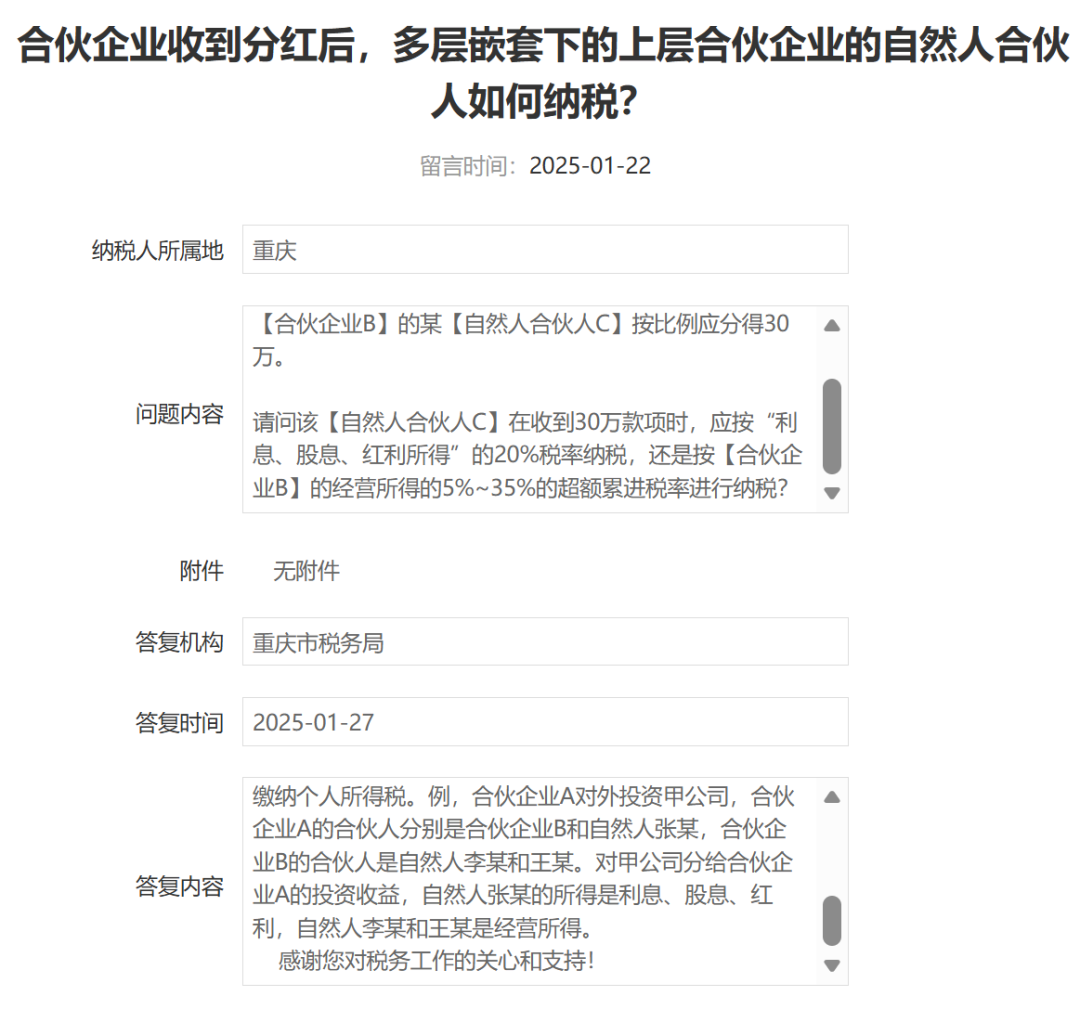 问题内容:某【合伙企业A】收到对外投资公司的分红50万,【合伙企业A】的有限合伙人之一【合伙企业B】应分得40万,【合伙企业B】的某【自然人合伙人C】按比例应分得30万。