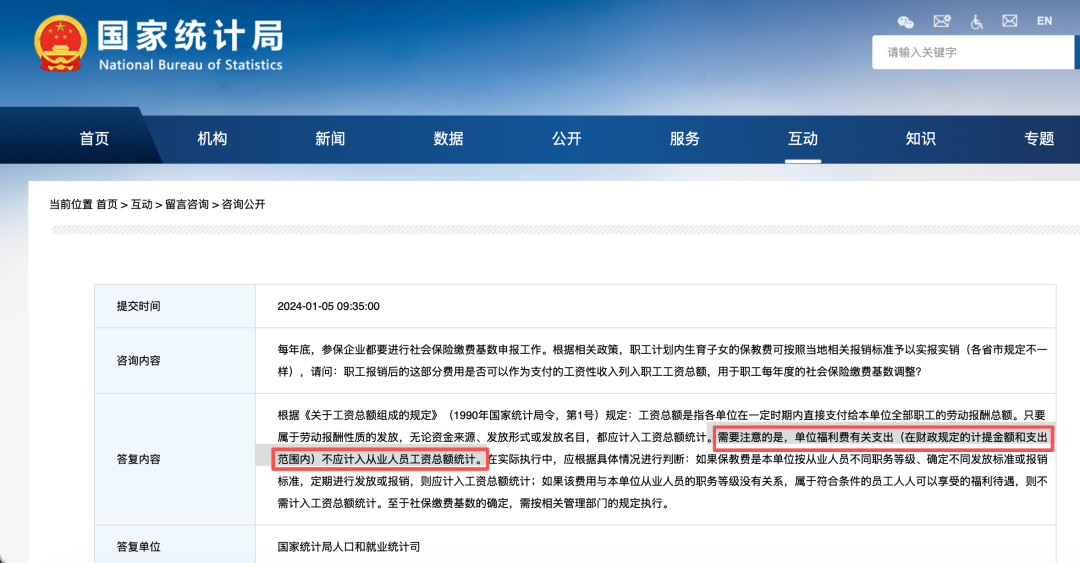答复内容:根据《关于工资总额组成的规定》(1990年国家统计局令,第1号)规定:工资总额是指各单位在一定时期内直接支付给本单位全部职工的劳动报酬总额。只要属于劳动报酬性质的发放,无论资金来源、发放形式或发放名目,都应计入工资总额统计。需要注意的是,单位福利费有关支出(在财政规定的计提金额和支出范围内)不应计入从业人员工资总额统计。在实际执行中,应根据具体情况进行判断:如果保教费是本单位按从业人员不同职务等级、确定不同发放标准或报销标准,定期进行发放或报销,则应计入工资总额统计;如果该费用与本单位从业人员的职务等级没有关系,属于符合条件的员工人人可以享受的福利待遇,则不需计入工资总额统计。至于社保缴费基数的确定,需按相关管理部门的规定执行。