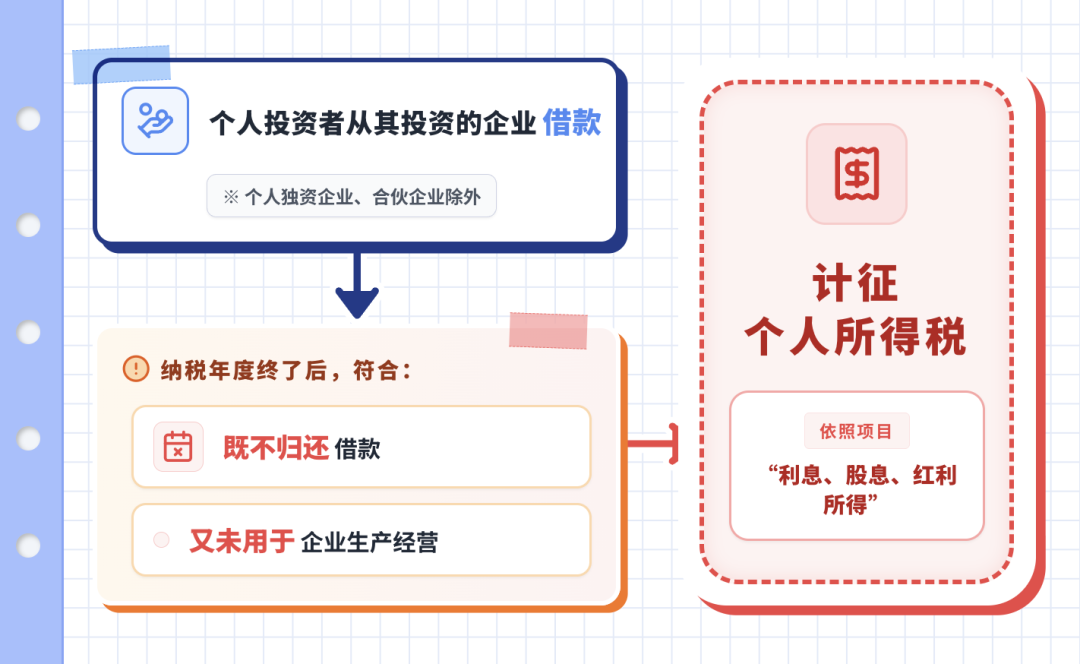 纳税年度内个人投资者从其投资的企业(个人独资企业、合伙企业除外)借款,在该纳税年度终了后既不归还,又未用于企业生产经营的,其未归还的借款可视为企业对个人投资者的红利分配,依照“利息、股息、红利所得”项目计征个人所得税。