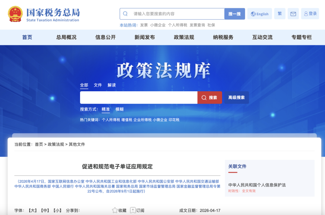 近日,国家网信办、工信部、公安部、交通运输部、商务部、人民银行、海关总署、税务总局、市场监管总局、金融监管总局十部门联合发布《促进和规范电子单证应用规定》,自2026年9月1日起施行。新规将电子提单、电子仓单、电子货运单等纳入统一法律框架,明确要求可靠电子单证系统须实现信息全程可追溯、不可篡改、签发人可识别等核心功能,并建立多部门协同监管机制,填补了电子单证法律效力长期不明确的制度空白。就税务实务而言,新规的影响主要体现在以下两个维度。
