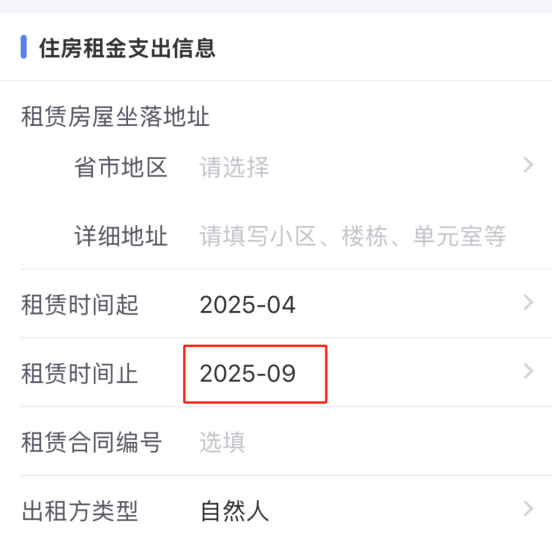 举例:小李2025年4月租了一套房,租期到当年9月30日,但因工作地变更,9月初他又在新工作地附近租了一套房,这样一来,9月份两套房子就都在租期之内了。这种情况下,小李在填报“住房租金专项附加扣除信息”时,就可以保持之前的信息不变,新的住房“租赁时间起”填写为2025年10月,这样两处房子的租房起止时间就不会重叠了。