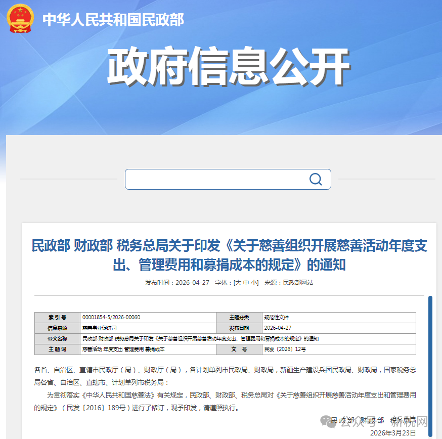民政部会同财政部、税务总局印发了《关于慈善组织开展慈善活动年度支出、管理费用和募捐成本的规定》