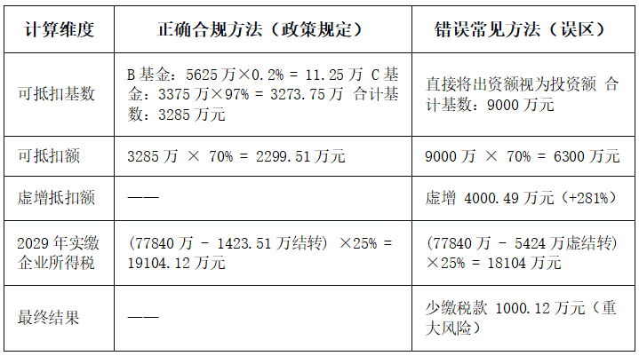 错误操作:A公司财务人员直接将自己对两只基金的出资总额(9000万元)作为基数,计算可抵扣额6300万元(9000万×70%)。