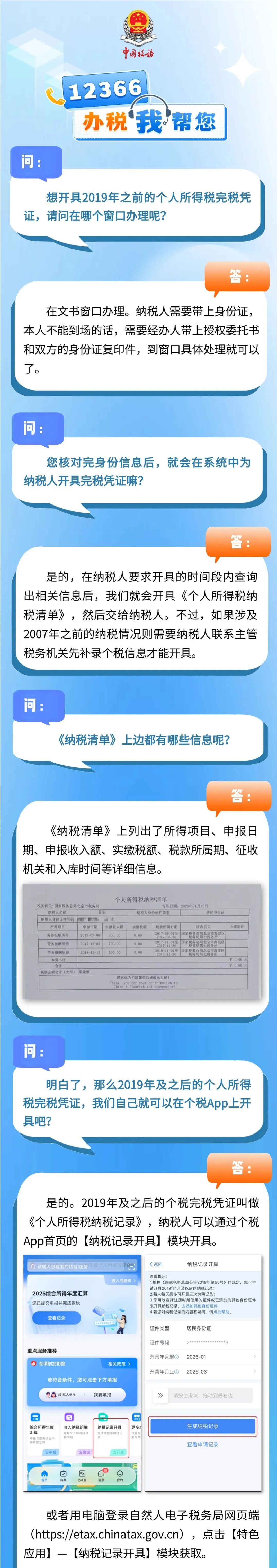 “12366办税我帮您”线下篇第5期来啦~本期纳税人的问题是2019年之前的个人所得税完税凭证不能在个人所得税App上开具,该如何获取呢?让我们跟着12366的小伙伴去办税大厅看看具体流程吧↓