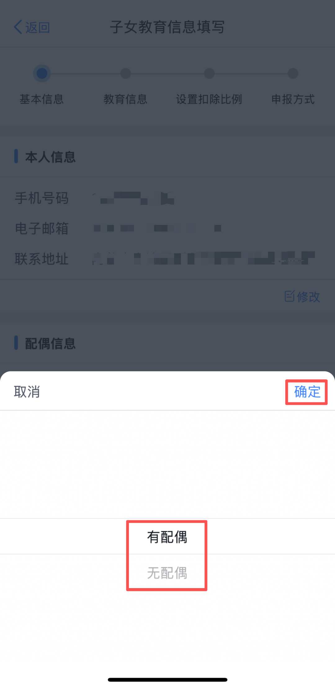 填写基本信息,确认本人手机号码、电子邮箱、联系地址,若本人信息有误点击【修改】,更正信息后保存。填写配偶信息,根据实际情况选择有无配偶,若选择有配偶则需填写配偶详细信息及婚姻情况,滑动验证通过后保存。配偶信息填写完整后点击【下一步】。