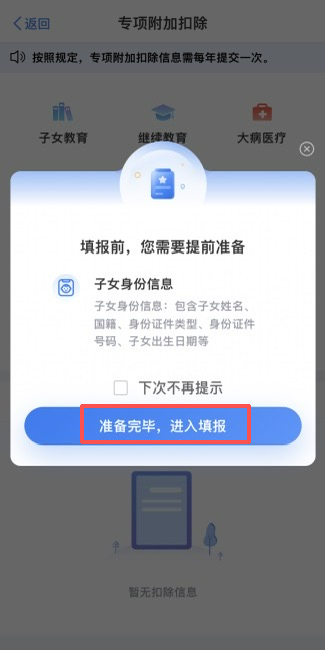 在页面中选择要填报的专项附加扣除类型,点击【子女教育】,系统提示选择扣除年度,点击【确认】,系统提示填报前您需要提前准备子女教育信息:包含受教育阶段、受教育时间段等;子女、配偶身份证件号码:如果没有配偶,可不填写配偶身份信息。在准备好相关信息后,点击【准备完毕,进入填报】。