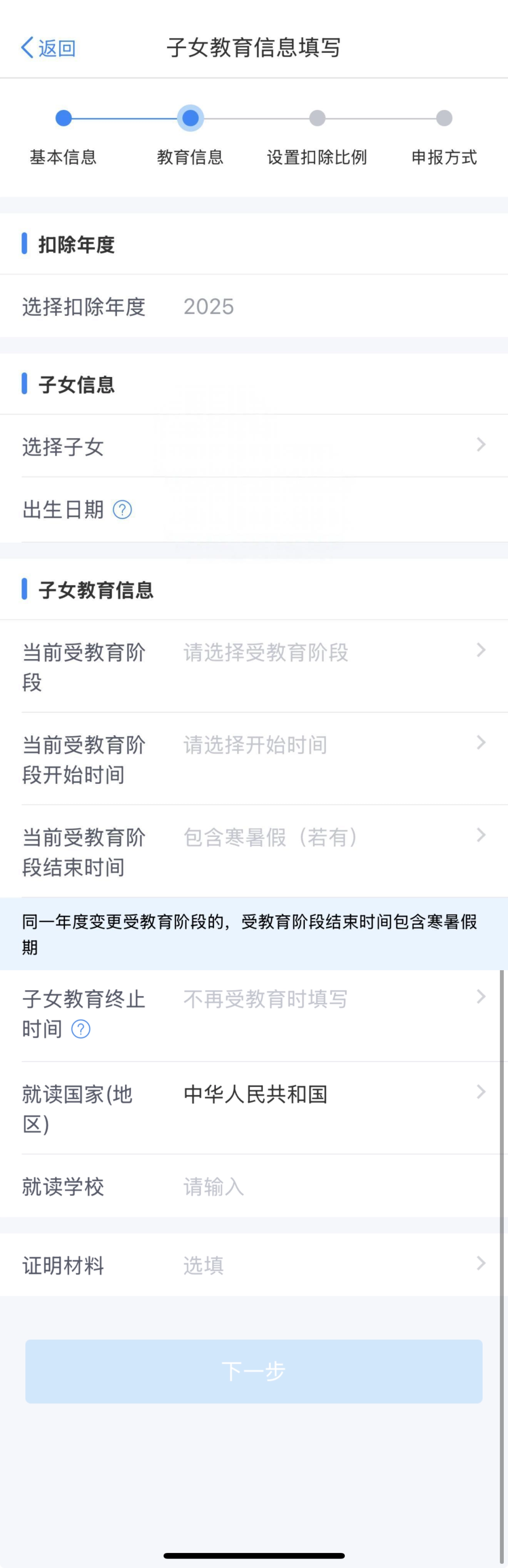 填写子女教育信息,根据实际情况选择子女的当前受教育阶段,选择当前受教育开始时间。当前受教育阶段结束时间为选填,子女因就业或其他原因不再继续接受全日制学历教育时填写,当前受教育阶段毕业,但还会继续接受全日制学历教育的无需填写。根据子女的实际就读情况选择就读国家(地区)并输入就读学校。子女在中国境外接受教育的,纳税人应当留存境外学校录取通知书、留学签证等相关教育的证明资料备查。上述信息填写完成后点击【下一步】。
