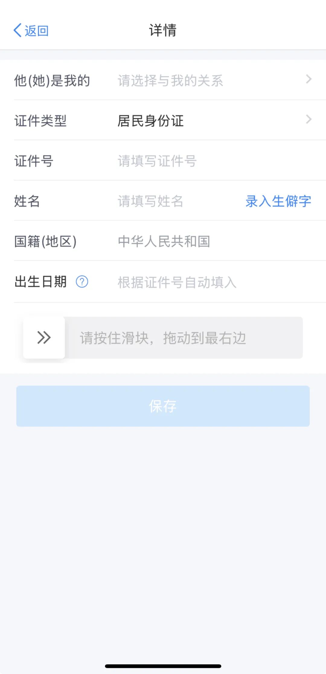 根据实际情况,选择与您的关系为“子”或“女”,选择证件类型并输入准确的证件号和姓名,滑动验证通过后点击保存。若您有多位子女可重复上述步骤填写每位子女的详细信息。添加完毕后选择子女信息并点击【下一步】。