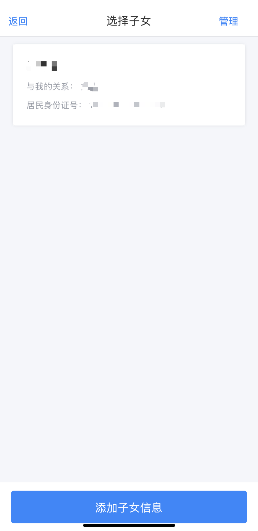 填写【子女信息】,点击【选择子女】,若已有子女信息,则直接点击选择子女信息,点击【下一步】;若无子女信息或者添加其他子女信息,点击【添加子女信息】。
