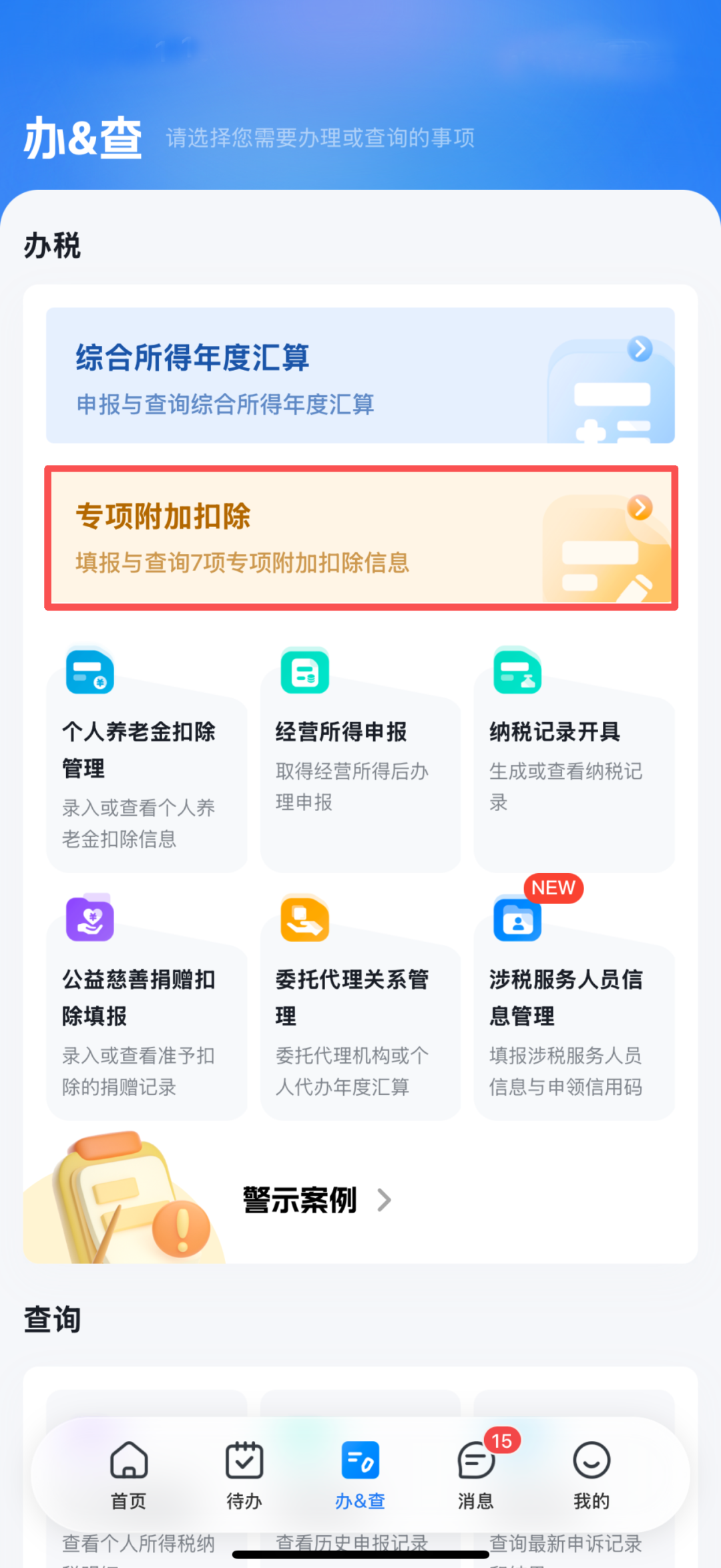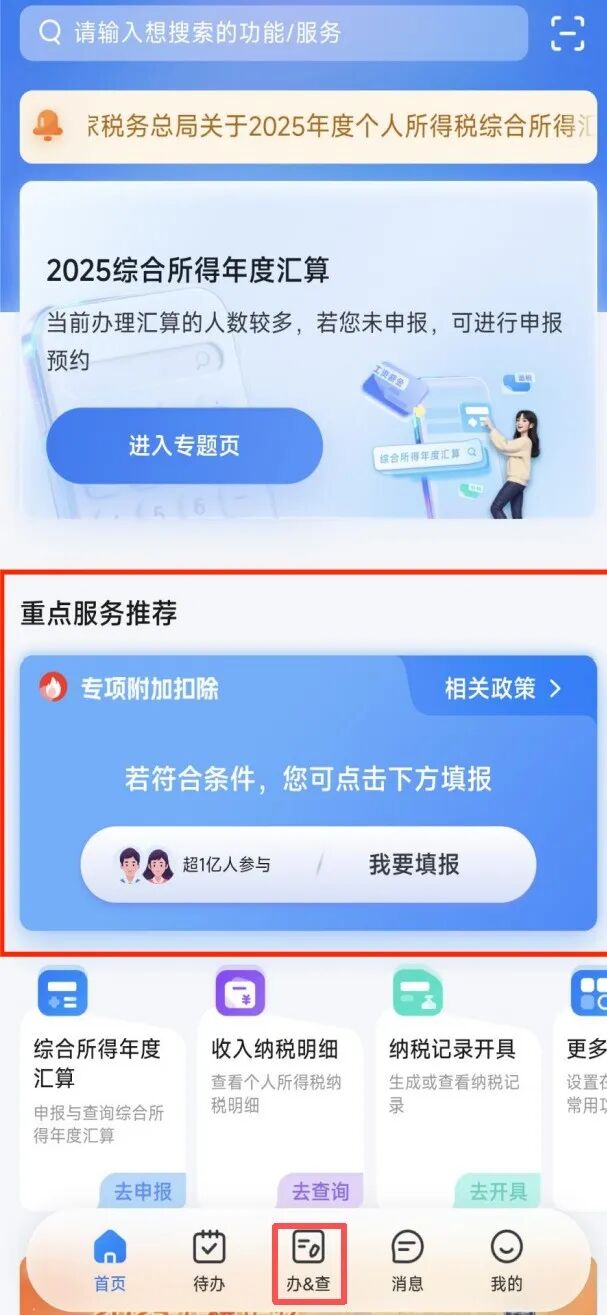 登录个人所得税APP,页面下方选择【办&查】,点击【专项附加扣除】。也可通过首页的重点服务推荐进入【专项附加扣除】。