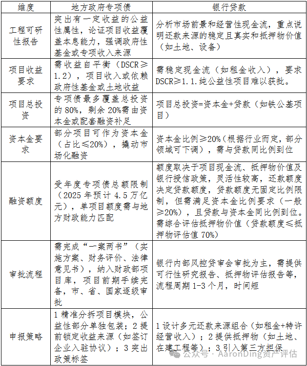 关键节点:专项债需通过财政部“一案两书”(实施方案、财务评价、法律意见书)审核,环节多周期长;贷款需提交银行认可的可行性研究报告及抵押物评估。