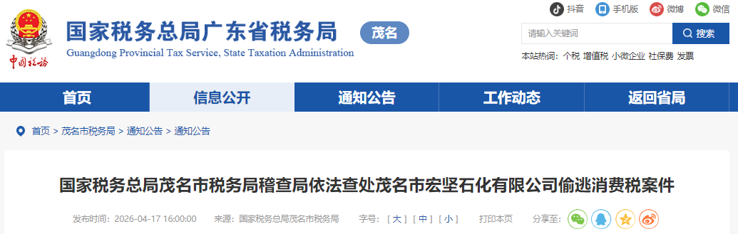 前期,国家税务总局茂名市税务局稽查局依法查处茂名市宏坚石化有限公司(以下简称“宏坚石化”)偷税案件。经查,2023年,宏坚石化主要销售成品油等应征消费税商品,通过账外调和应税油品销售、进行虚假纳税申报等方式,少缴消费税等税费共计227.32万元。2024年12月,国家税务总局茂名市税务局稽查局依法对其作出追缴税费款并处罚款共计449.28万元的处理处罚决定,并加收滞纳金。