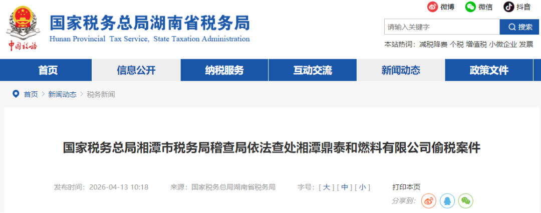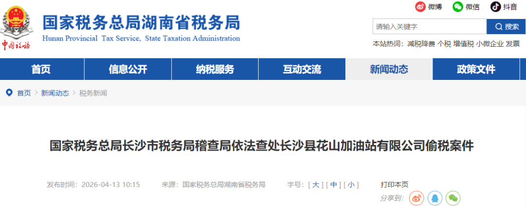 依据上述法律法规规定,2025年1月,国家税务总局长沙市税务局稽查局依法对该加油站的违法行为,作出追缴税费款、加收滞纳金并处罚款共计358.07万元的处理处罚决定。目前,涉案税费款、滞纳金及罚款均已追缴入库。