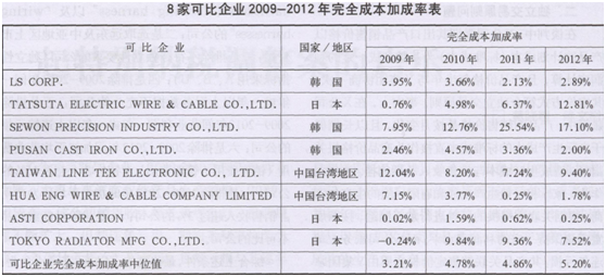 综合上述条件,最终选取了以下8家可比企业:①LS CORP.;②TATSUTA ELECTRIC WIRE& CABLE CO.,LTD.;③SEWON PRECISION INDUSTRY CO.,LTD.;④PUSAN CAST IRON CO.,LTD.;⑤TAIWAN LINE TEK ELECTRONIC CO., LTD.;⑥HUA ENG WIRE&CABLE COMPANY LIMITED;⑦ASTI CORPORATION;⑧TOKYO RADIATOR MFG CO LTD.。