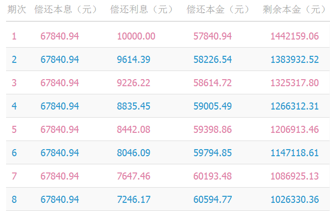 我们以一个案例来看一下。某承租企业有一项旧设备,初始购买价格是200万(不含增值税),现准备用这项设备向融资租赁公司做售后回租。融资租赁公司评估后认为该项设备可以贷款150万。因此,融资租赁公司和承租方签订一个150万的设备销售合同,同时签订一个融资租赁合同,约定利率8%,期限24个月,每期租金相等。这个实际上就是一个150万,2年期,8%年利率,等额本息的贷款。融资租赁公司每期收款明细如下:
