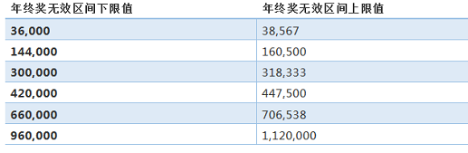 因为年终奖的税率是除以12,选择对应的税率,在临界点会存在年终奖多发1元,税后所得反而更低的情形,如下区间需避开,即年终奖选择相应的下限数。