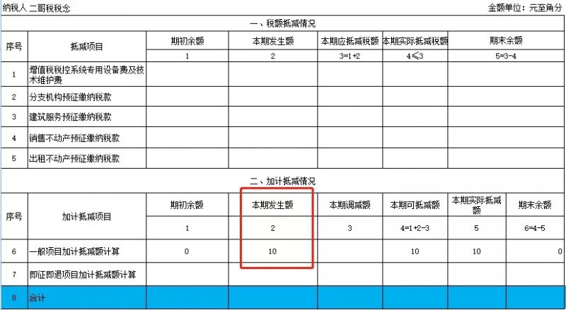 比如本期我销项减去进行120-100=20,和我可抵减数10比,我10完全可以全部抵减,那么第5列就全部填进去。