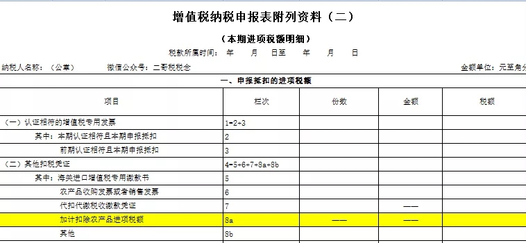 (1)附表二中农产品加计扣除栏次8a维持不变。
