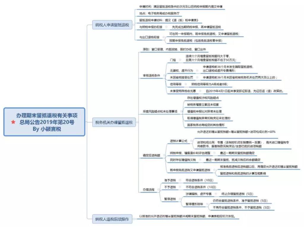 为方便纳税人办理留抵退税业务,国家税务总局发布《国家税务总局关于办理增值税期末留抵税额退税有关事项的公告》(国家税务总局公告2019年第20号,以下简称20号公告),自2019年5月1日起施行。该文件从纳税人申报退税、税务机关办理留抵退税、纳税人退税后续操作等三个方面对期末留抵退税的全流程进行了明确,下面小编结合《关于深化增值税改革有关政策的公告》(财政部税务总局 海关总署公告2019年第39号)对增值税期末退税全流程进行解析。