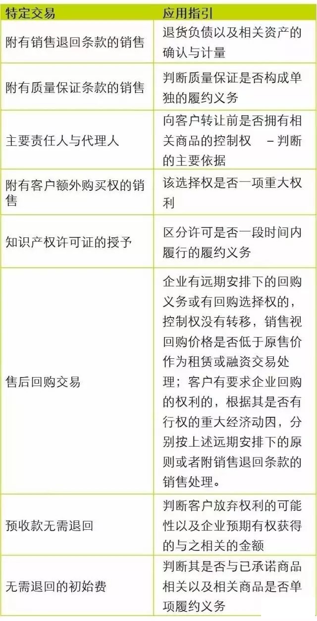 新收入准则就将收入确认模型应用于特定交易提供了指引,其涵盖的特定交易及指引的重点如下: