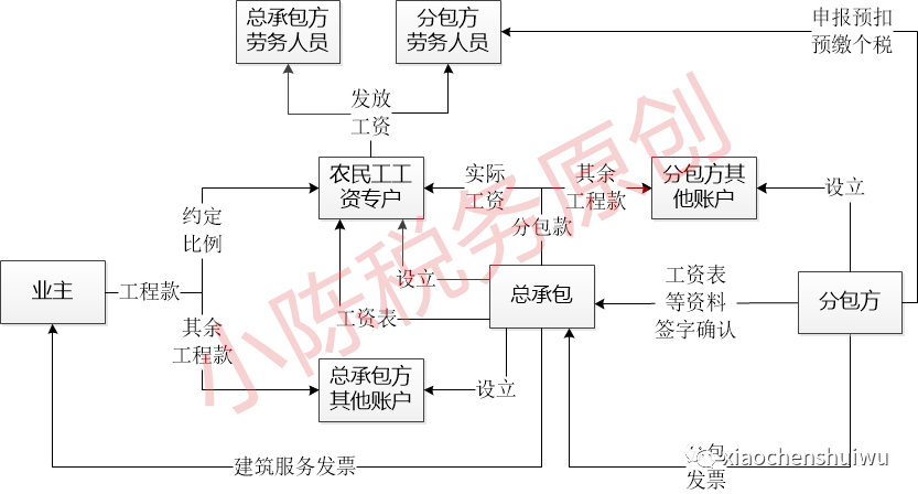 工程建设领域应当实行分包单位农民工工资委托施工总承包单位代发制度。劳务/专业分包企业负责按月考核农民工工作量并编制工资支付表,经农民工本人签字确认后,与当月工程进度等情况一并交施工总承包单位。施工总承包单位应当根据分包单位编制的工资支付表,通过农民工工资专用账户直接将工资划入农民工的社会保障卡或者其本人工资支付银行卡。