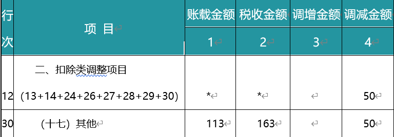 30.第30行“(十七)其他”:填报其他因会计处理与税收规定有差异需纳税调整的扣除类项目金额,企业将货物、资产、劳务用于捐赠、广告等用途时,进行视同销售纳税调整后,对应支出的会计处理与税收规定有差异需纳税调整的金额填报在本行。若第1列≥第2列,第3列“调增金额”填报第1-2列金额。若第1列<第2列,第4列“调减金额”填报第1-2列金额的绝对值。