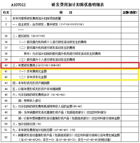 最后,A107012将自主研发、集中研发、合作研发和委托外部研发的80% 加上符合条件的委托境外研发,这三部分数据加总作为年度研发费用小计(2+36×80%+38)。